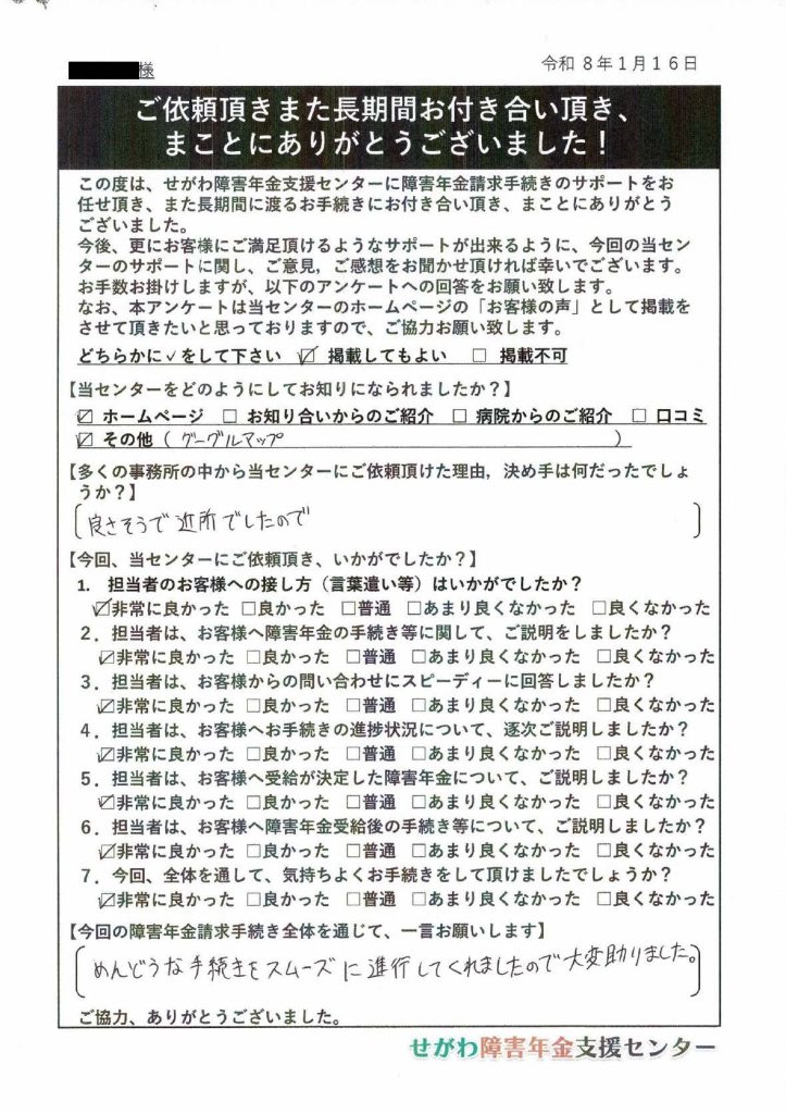 ご協力により、目標通りの障害年金の受給が決定しました。ありがとうございました。