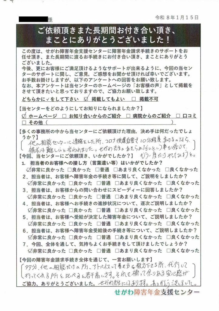 50代 コロナ後遺症による障害で障害基礎年金2級を受給できたお客様から頂きましたご意見(アンケート結果)