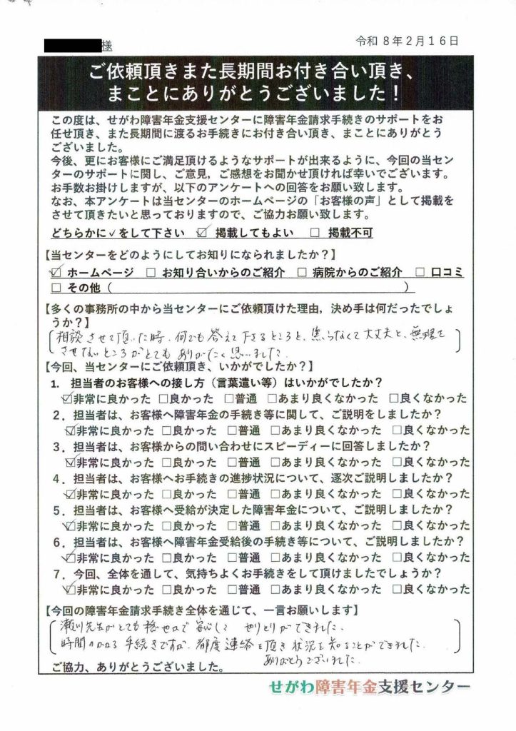 20代 女性 双極性障害による精神の障害で障害基礎年金2級を受給できたお客様から頂きましたご意見(アンケート結果)
